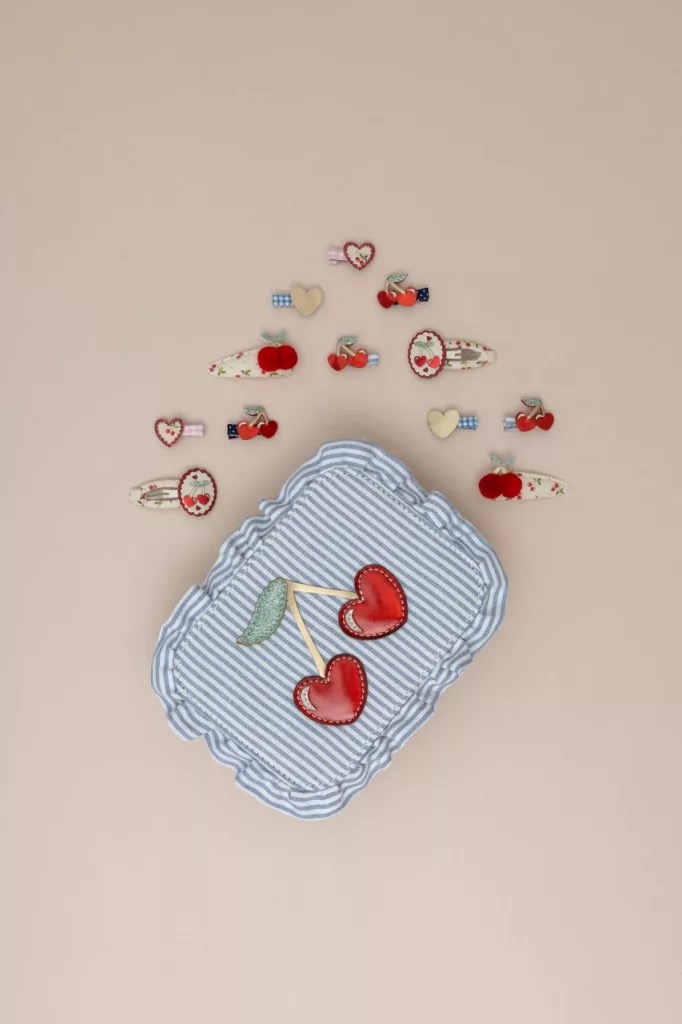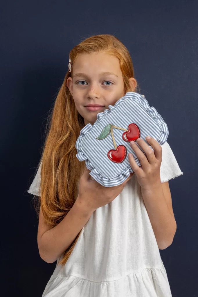 Bájos és praktikus kiegészítő a mindennapokra! A csíkos cseresznyés kistáska halványkék-fehér csíkos anyagával, fodros szegélyével és látványos, fémesen csillogó piros cseresznyéivel igazán különleges megjelenést ad minden öltözéknek.